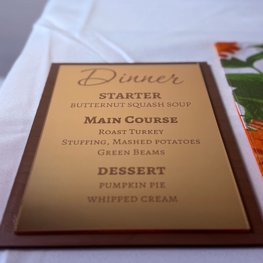 Each menu is laser-engraved and layered with your choice of mirror acrylic and wood, creating a warm, elegant look that complements your entire tablescape.